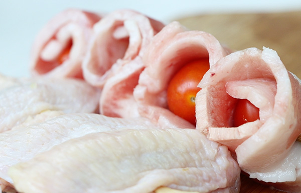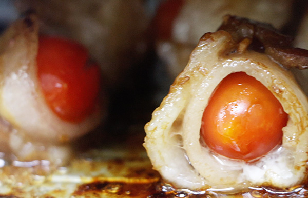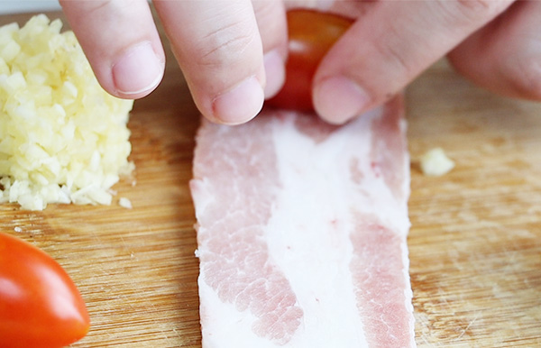 ▼用豬肉片把小番茄捲捲捲包起來,再拿竹籤把包好的豬肉番茄串在一起。