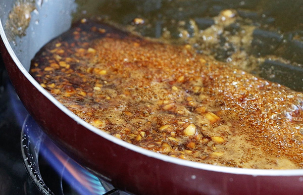 持續攪拌與加熱鍋中的醬汁,煮到稍微縮汁之後質地變得較濃稠,但要留意避免燒焦。