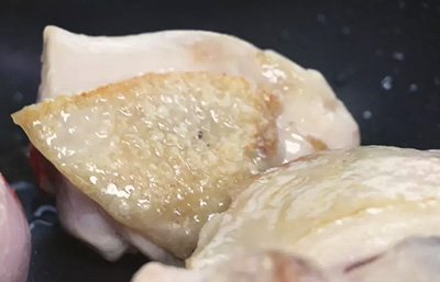 步驟4、撒入少量鹽巴 將雞肉煎至半熟