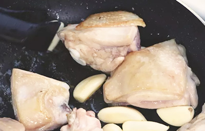 步驟5、將一半的蒜頭加入一起拌煎 將雞腿肉煎至金黃色