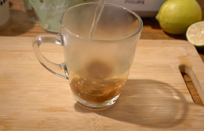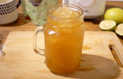 步驟1、冬瓜茶磚放入杯中,加入適量熱水,融化茶磚,變成冬瓜茶(水量可蓋過茶磚且融化即可)