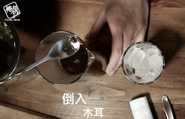 從融化完的桂圓銀耳中,把銀耳撈出,放入冰塊杯中。